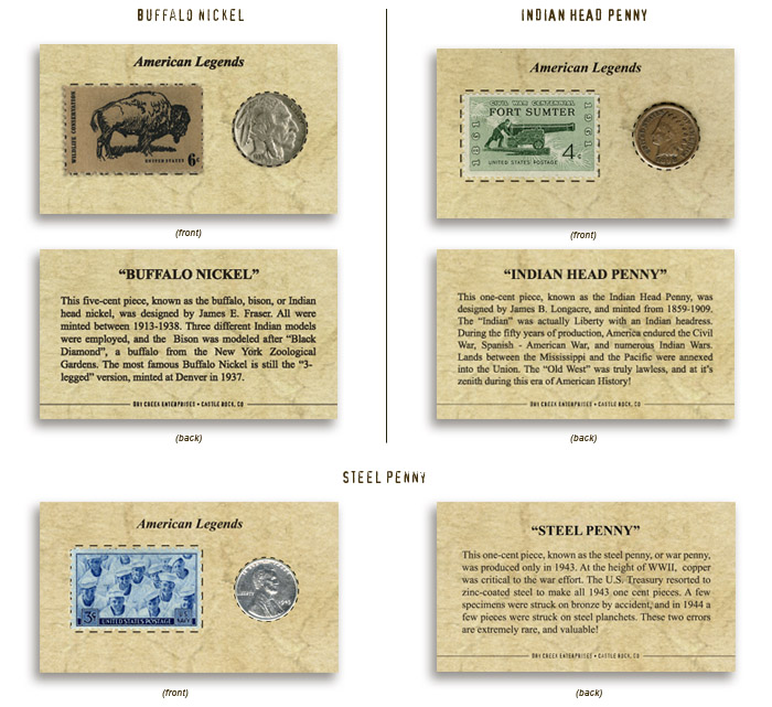 Coin and Stamp sets These coin and stamp sets are printed on heavy #1 gloss paper stock (2" x 3.5"). Front consists of either Buffalo/Indian nickel (1913-1938), Indian head penny (1859-1909), or Steel cent (1943) along with a mint, unused, antique U.S. Postage stamp. A brief story of each different coin is printed on the reverse.